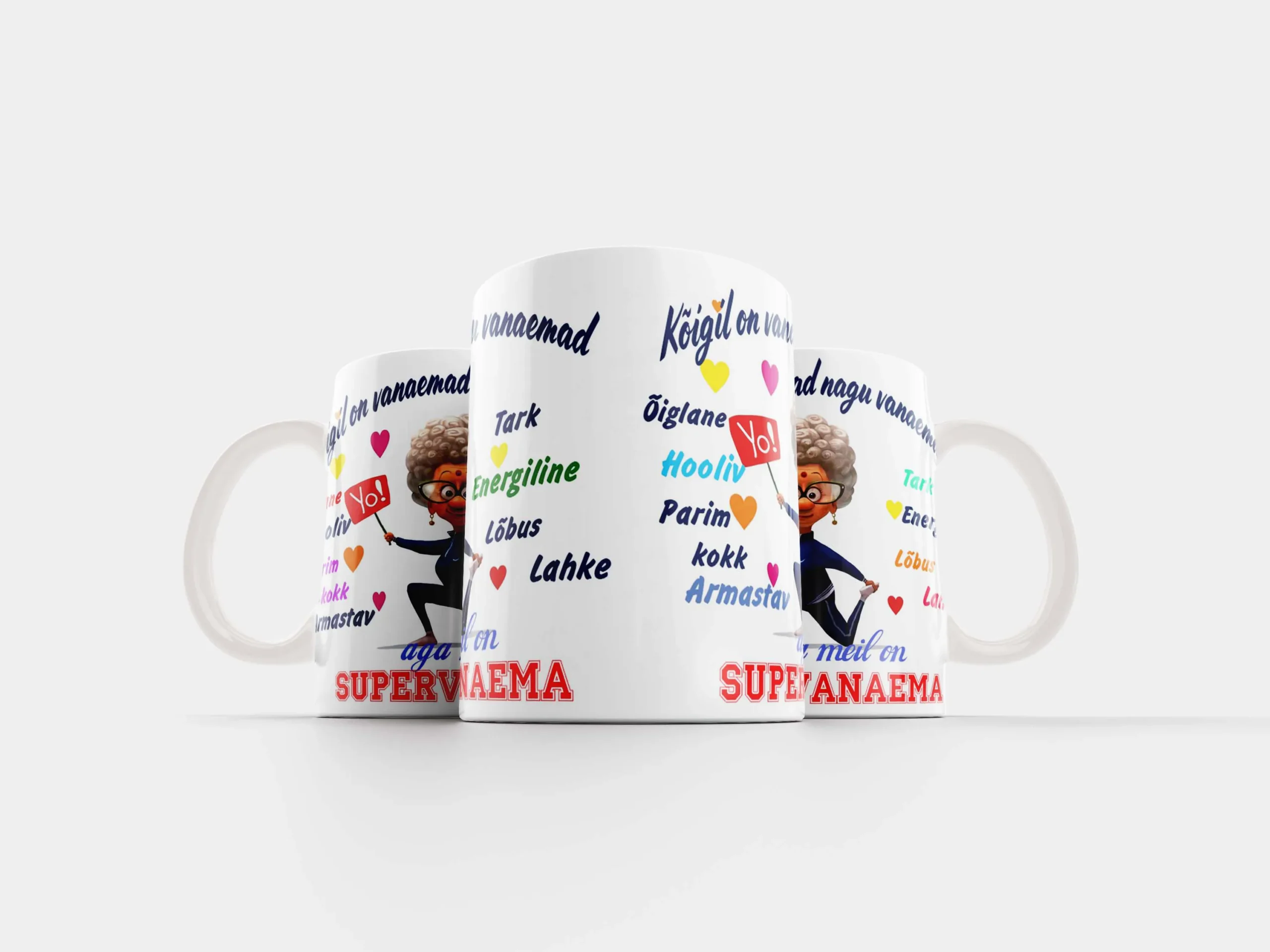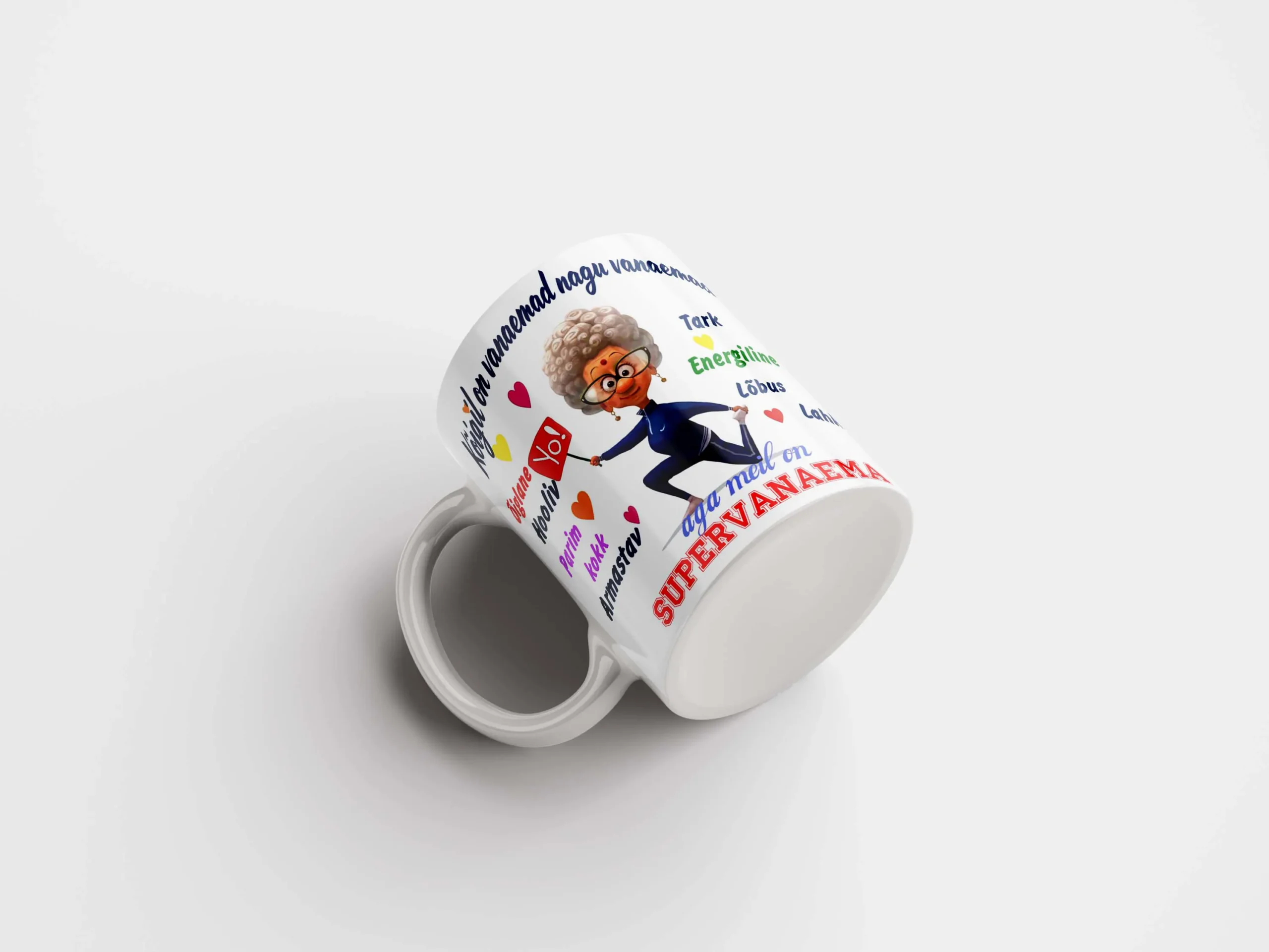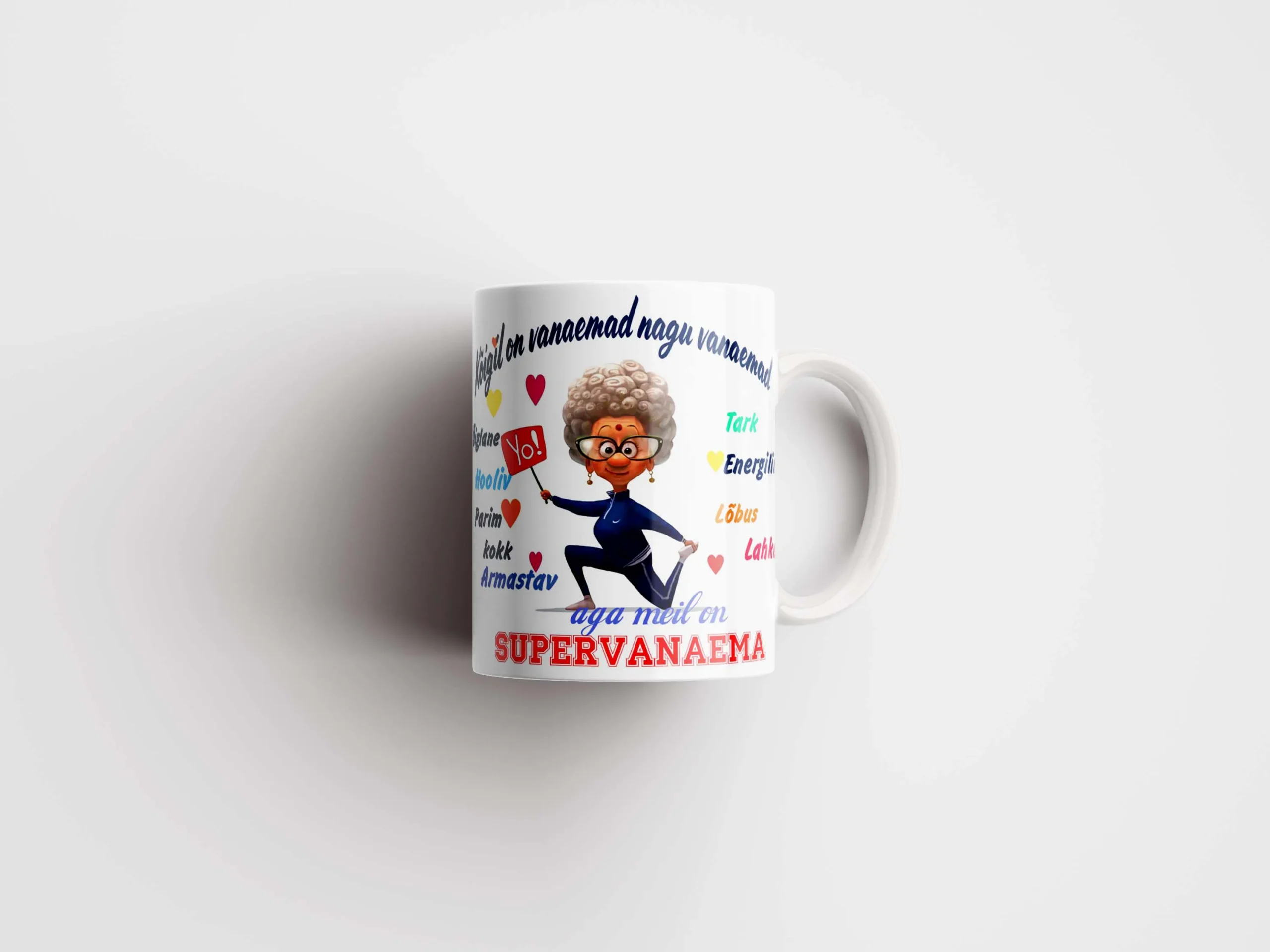 Tass “Supervanaema” ühendab tunnustuse ja praktilisuse. See ei ole juhuslik ese. See on sõnum: vanaema ei ole lihtsalt vanaema – ta on supervanaema.